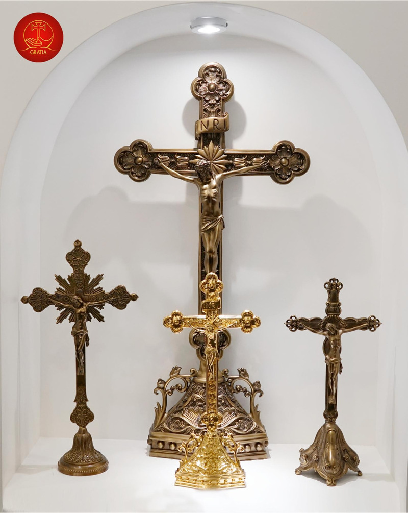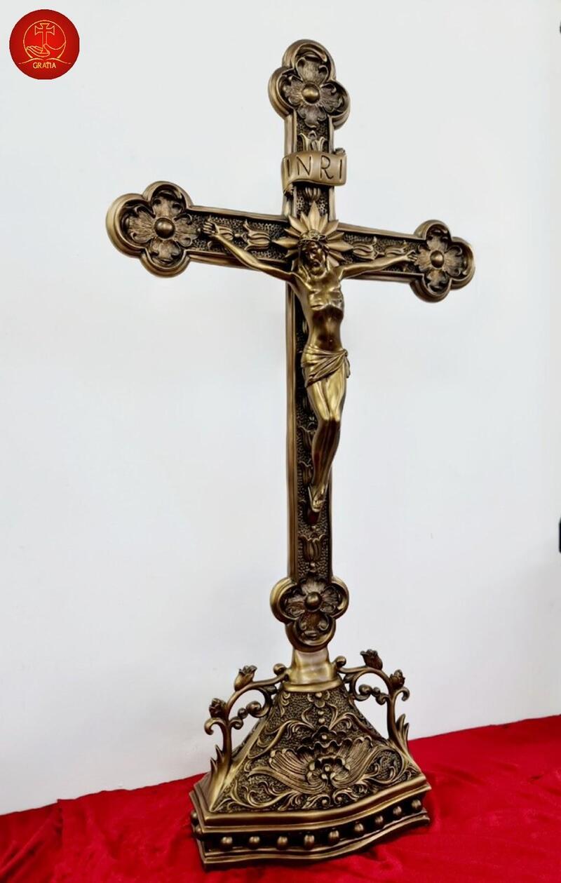 Chất liệu đồng mang lại cảm giác cổ kính, vững chãi và uy nghiêm. Với đặc tính dễ tạo hình, đồng cho phép các nghệ nhân chạm khắc những chi tiết tinh xảo và phức tạp, làm nổi bật giá trị nghệ thuật của từng sản phẩm. Đồng thời, qua thời gian, thánh giá bằng đồng có thể chuyển màu patin độc đáo, tạo nên vẻ đẹp riêng biệt và mang đậm dấu ấn thời gian.