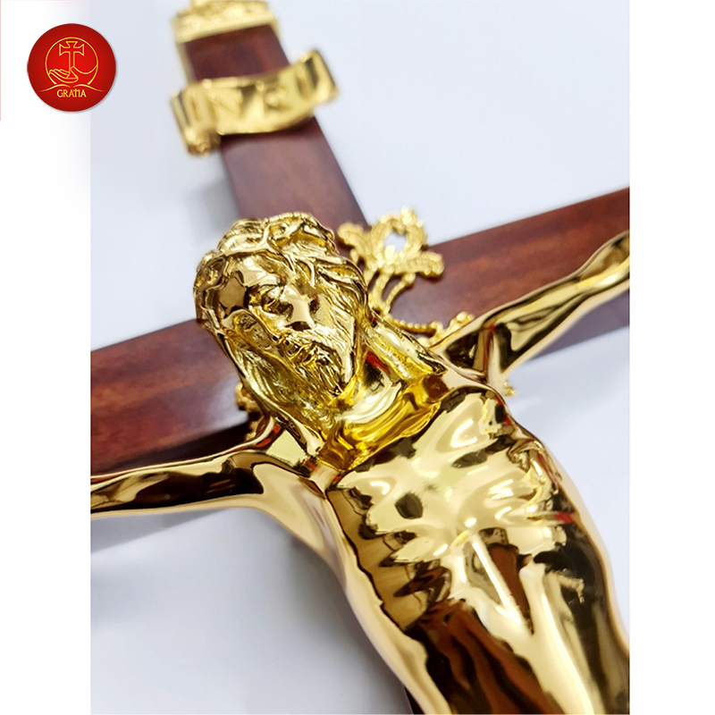 Chúa chịu chết thánh giá gỗ treo được làm bằng chất liệu đồng thau, công nghệ xử lý tạo màu sản phẩm mang màu sắc đặc trưng của Gratia, bề mặt sản phẩm được phủ một lớp bảo vệ giúp sản phẩm không bị ảnh hưởng từ môi trường, giữ cho màu sắc không bay màu.